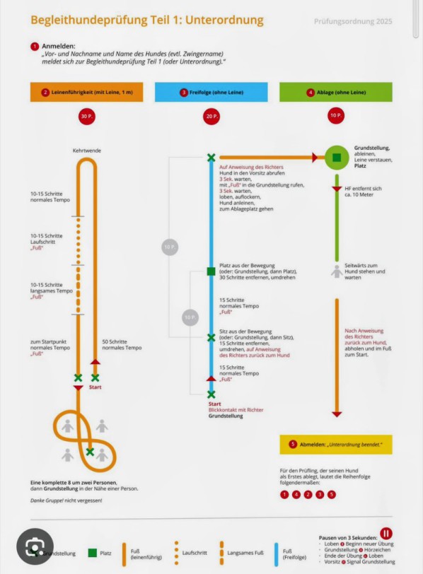 Hier werden die Hunde für die Begleithundeprüfung mit Verkehrsteil nach der Prüfungsordnung des FCI ausgebildet.